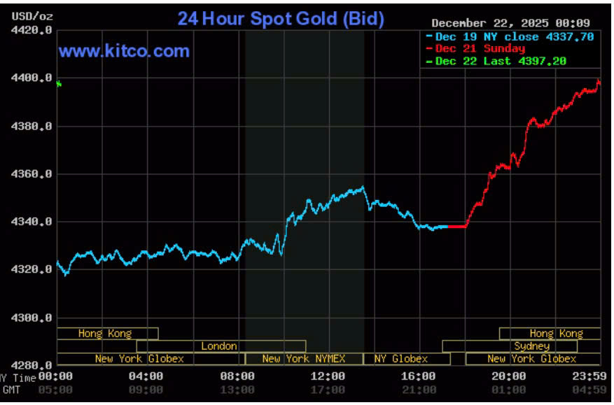 Trên thị trường quốc tế, giá vàng thế giới tăng lên 4.337,7 USD/ounce, cao hơn phiên trước gần 25 USD/ounce. Kim loại quý tiếp tục đi lên nhờ kỳ vọng Cục Dự trữ Liên bang Mỹ (Fed) sẽ tiếp tục cắt giảm lãi suất trong năm 2026.